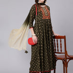 Rayon Calf Length Printed Semi Flared 3/4 Sleeve Round Neck Kurta Dupatta Pant Set (Preorder)