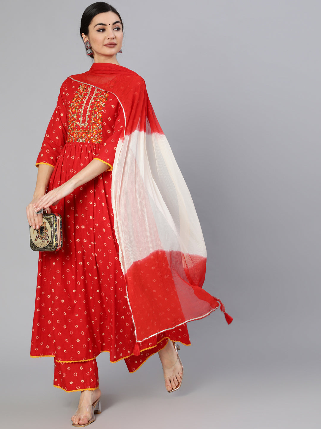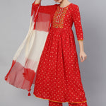 Rayon Calf Length Printed Semi Flared 3/4 Sleeve Round Neck Kurta Dupatta Pant Set (Preorder)