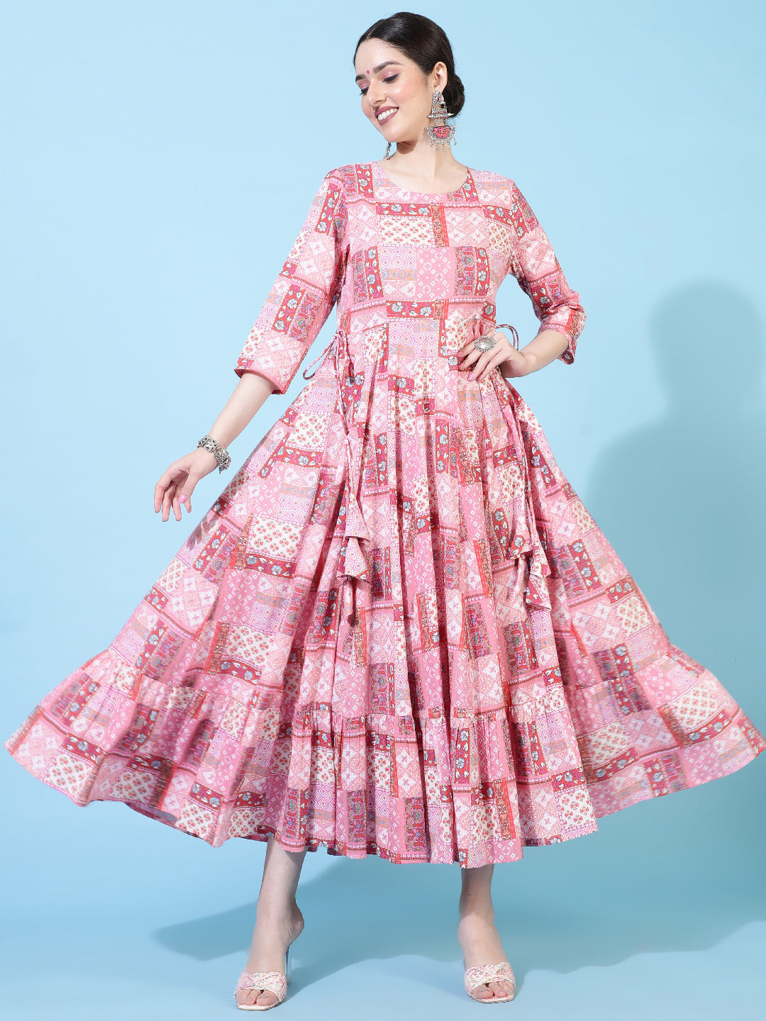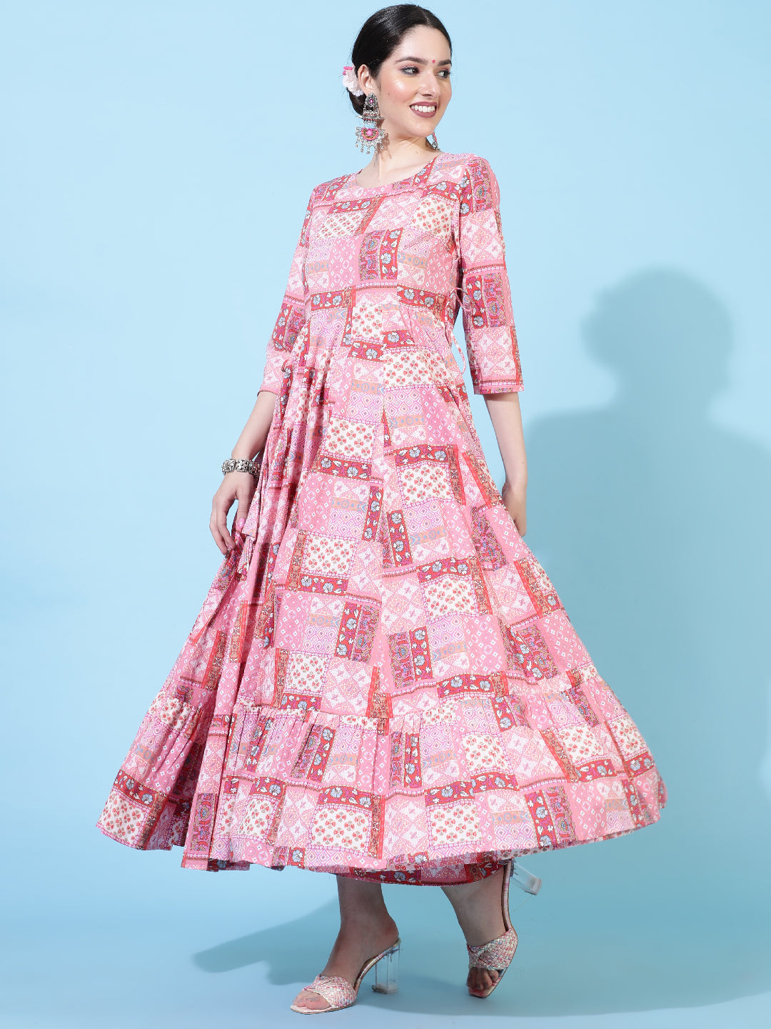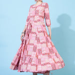 Cotton Calf Length Printed Flared 3/4 Sleeves Round Neck Kurta Set (Preorder)