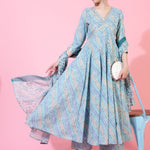 Cotton Calf Length Printed Flared 3/4 Sleeves V-Neck Kurta Bottom Dupatta Set (Preorder)