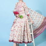 Cotton Calf Length Printed Flared 3/4 Sleeves Round Neck Kurta Bottom Dupatta Set (Preorder)