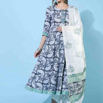 Cotton Calf Length Printed Flared 3/4 sleeves Round Neck Kurta Bottom Dupatta Set (Preorder)