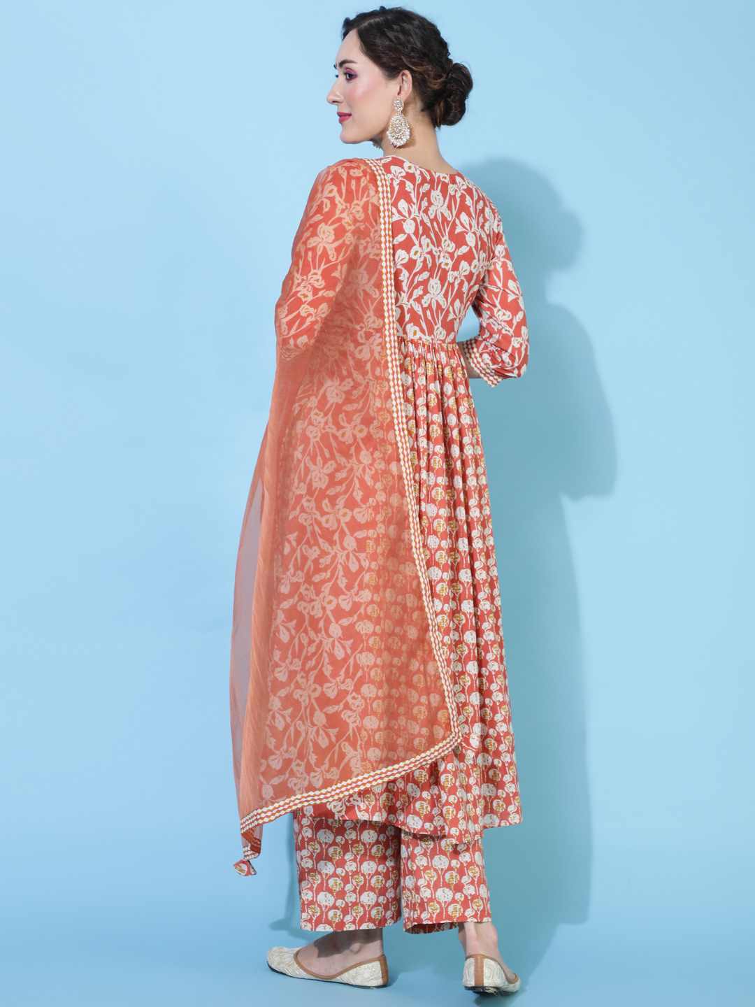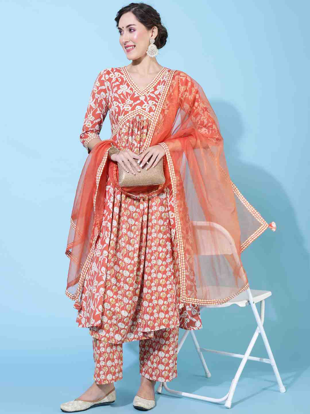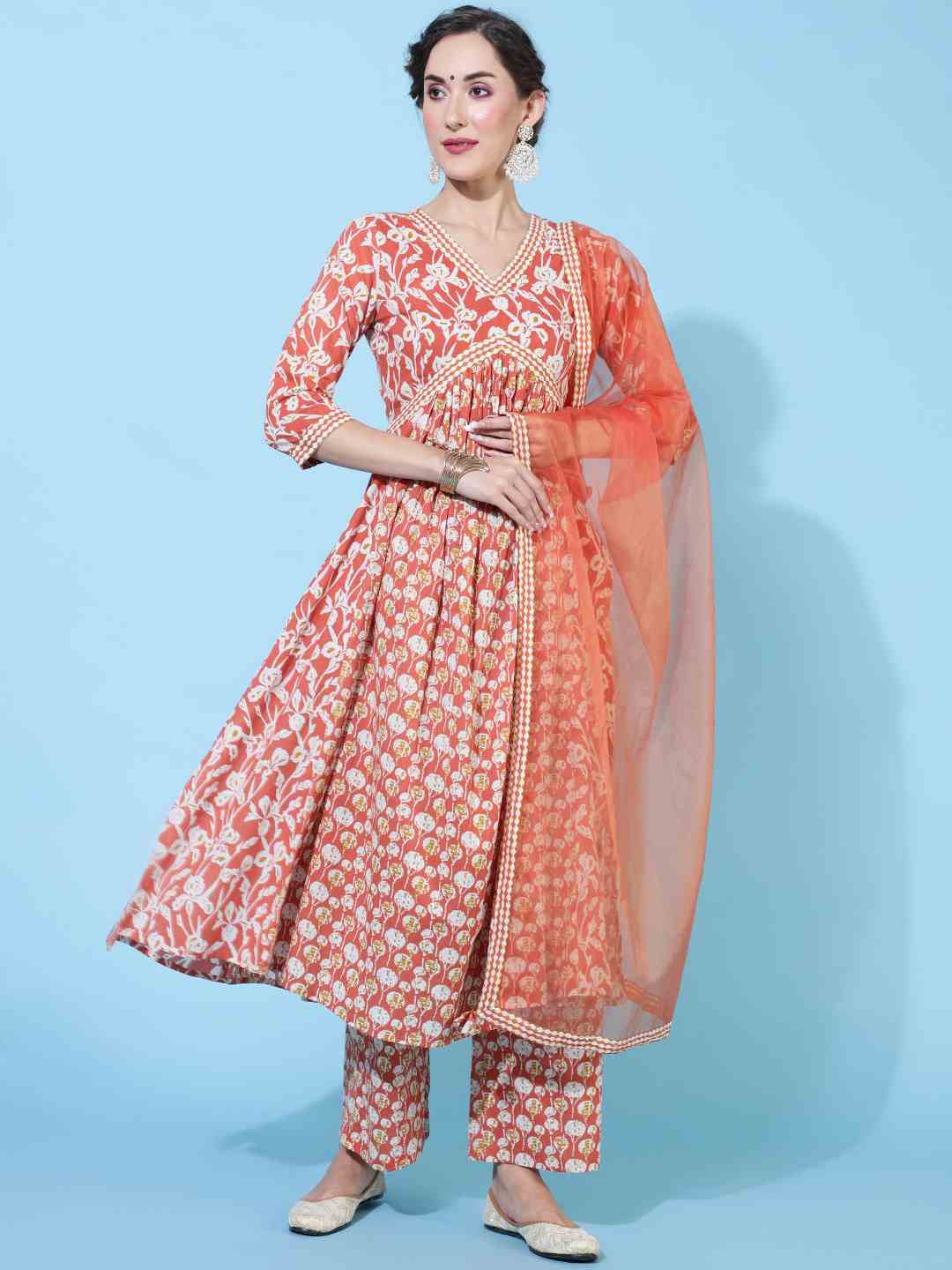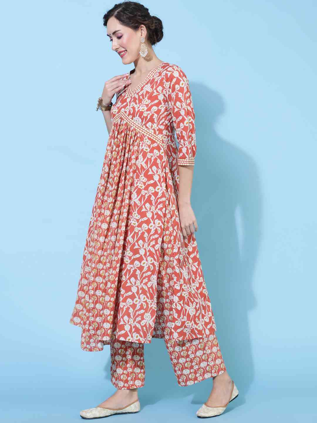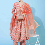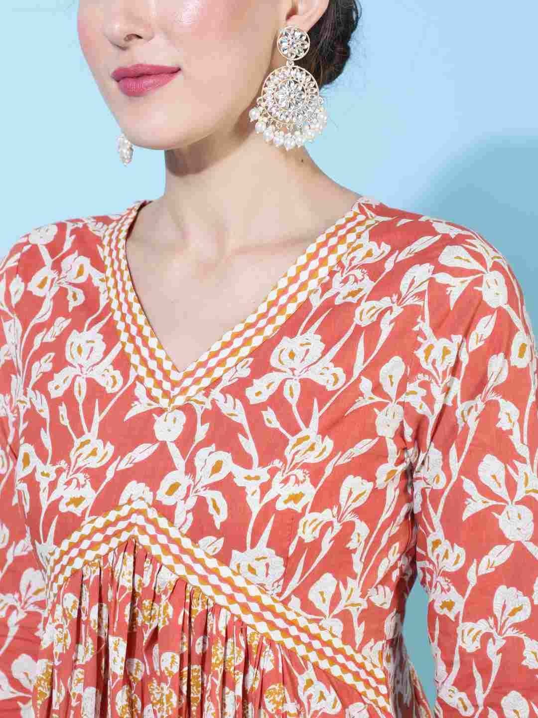 Cotton Calf Length Printed Flared 3/4 sleeves V neck Kurta Bottom Set (Preorder)