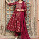 Rayon Calf Length Printed Flared 3/4 Sleeves Round Neck Kurta Bottom Dupatta Set (Preorder)