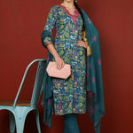 Cotton Calf Length Printed Straight 3/4 Sleeves V-Neck Kurta Bottom Dupatta Set (Preorder)