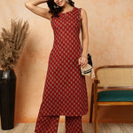 Cotton Calf Length Printed Straight Sleeveless Round Kurta Bottom Set (Preorder)