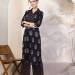 Black Cotton Calf Length Printed Straight 3/4 Sleeves Coller Kurta Bottom Set (Preorder)