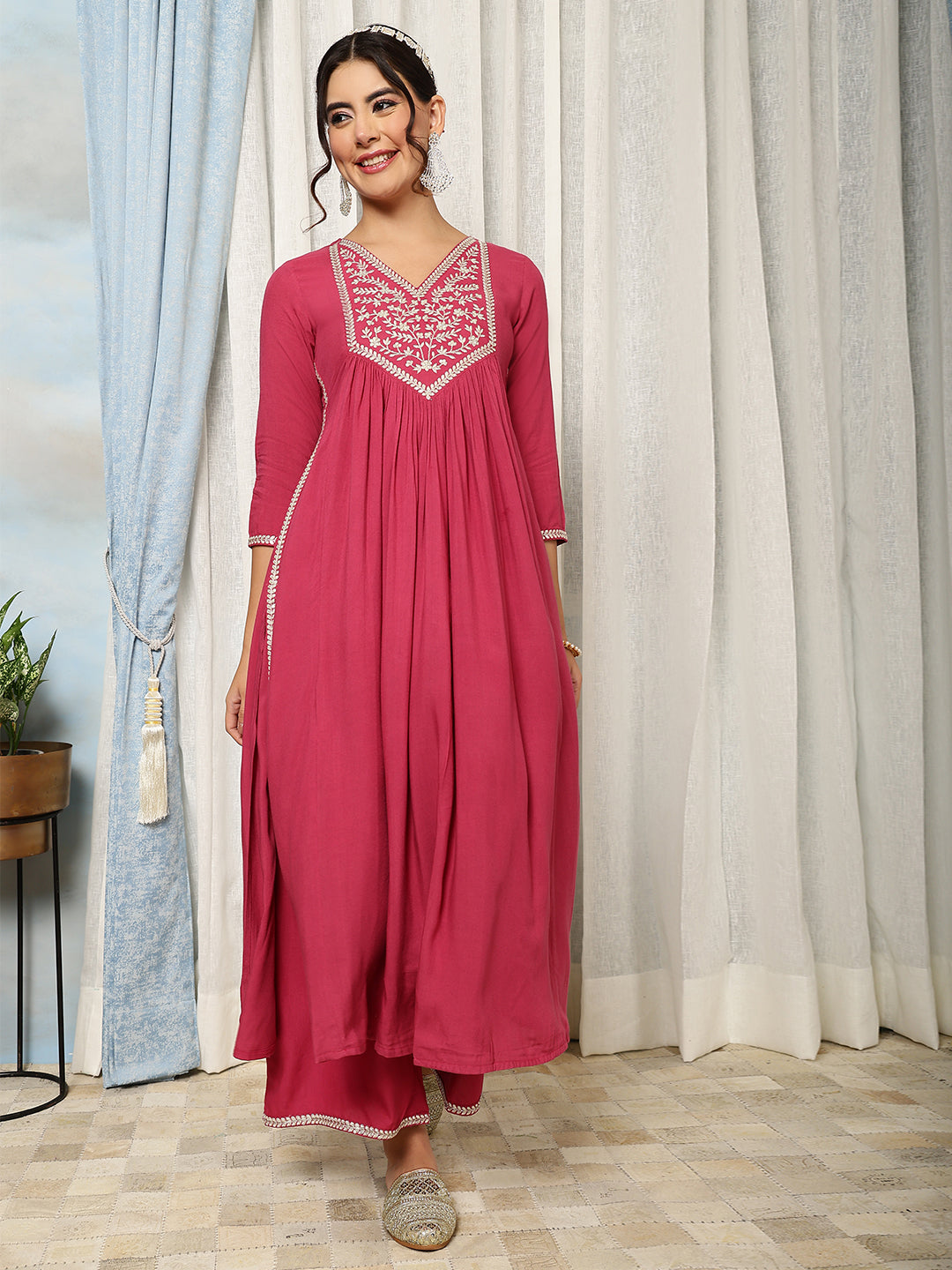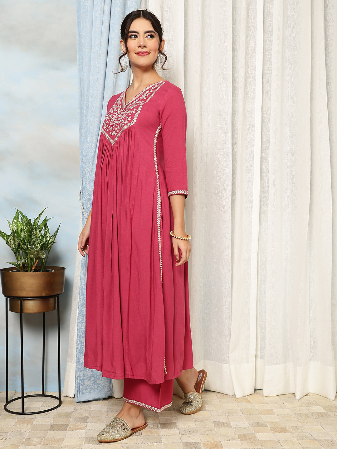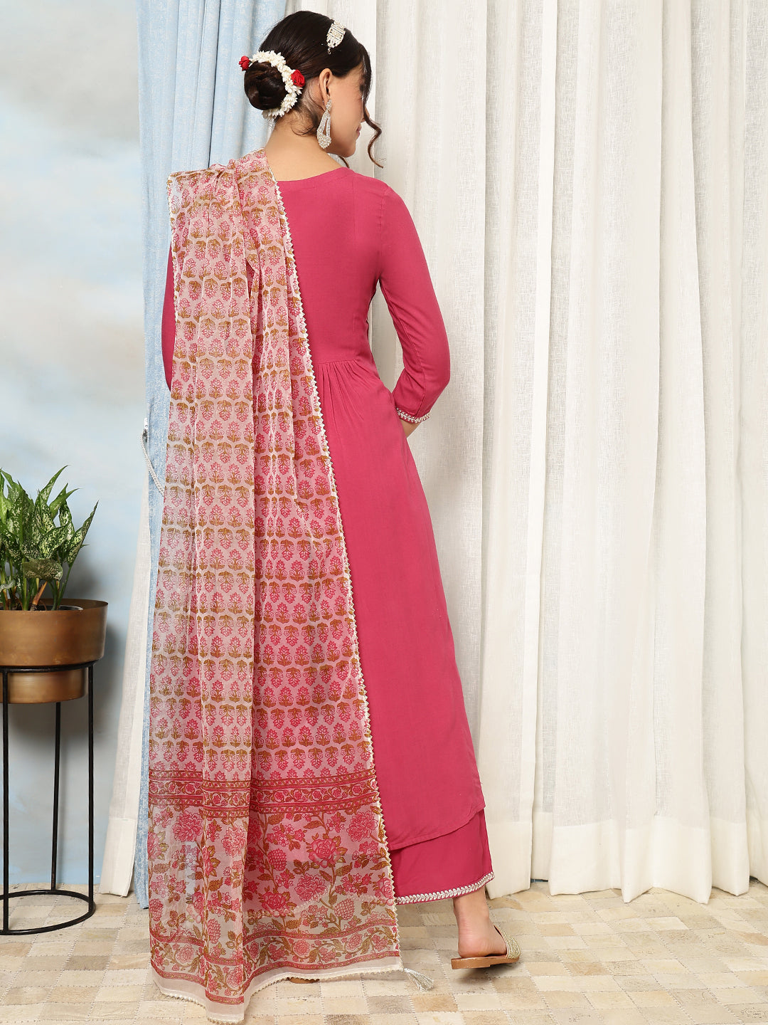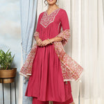 Rayon Calf Length Solid Flared 3/4 Sleeves V-Neck Kurta Bottom Dupatta Set (Preorder)