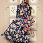 Cotton Calf Length Printed Flared 3/4 Sleeves Round Neck Kurta Bottom Dupatta Set (Preorder)