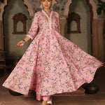 Cotton Calf Length Printed Flared 3/4 Sleeves V-Neck Kurta Suit Set (Preorder)