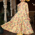 Cotton Calf Length Printed Flared 3/4 Sleeves V-Neck Kurta Suit Set (Preorder)