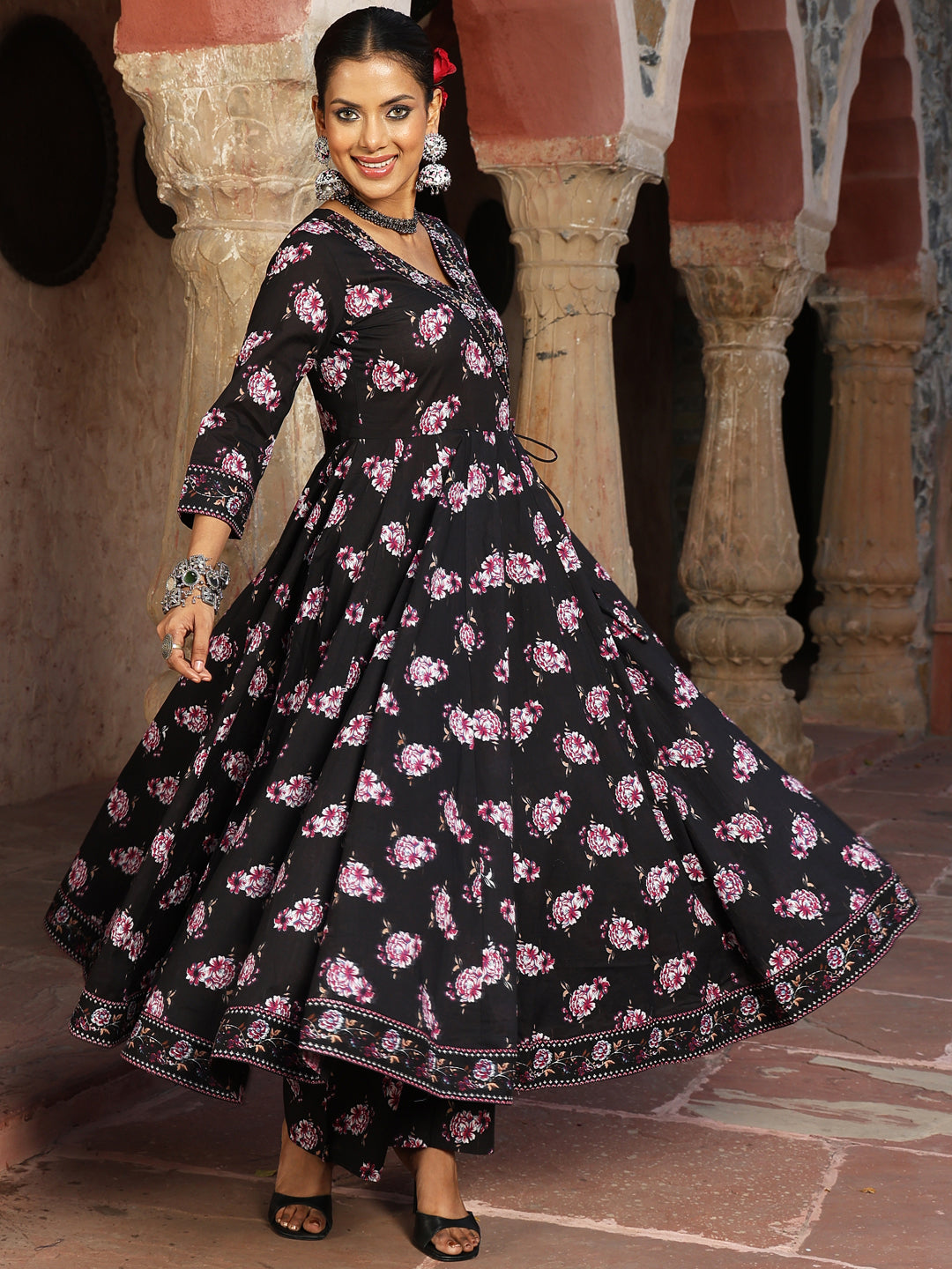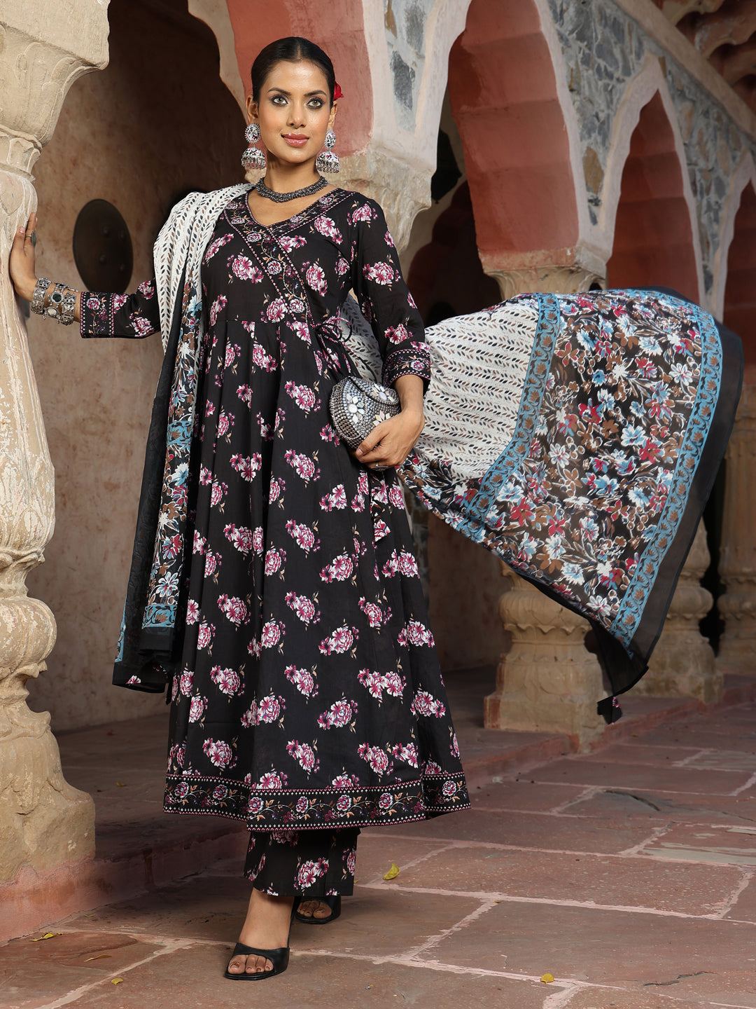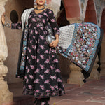 Cotton Calf Length Printed Flared 3/4 Sleeves V-Neck Kurta Suit Set With Dupatta (Preorder)