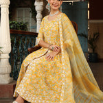Cotton Calf Length Printed Flared 3/4 Sleeves V-Neck Kurta Suit Set With Dupatta (Preorder)