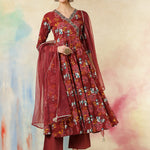 Cotton Calf Length Printed Embroidered 3/4 Sleeves V-Neck Kurta Suit Set With Dupatta (Preorder)