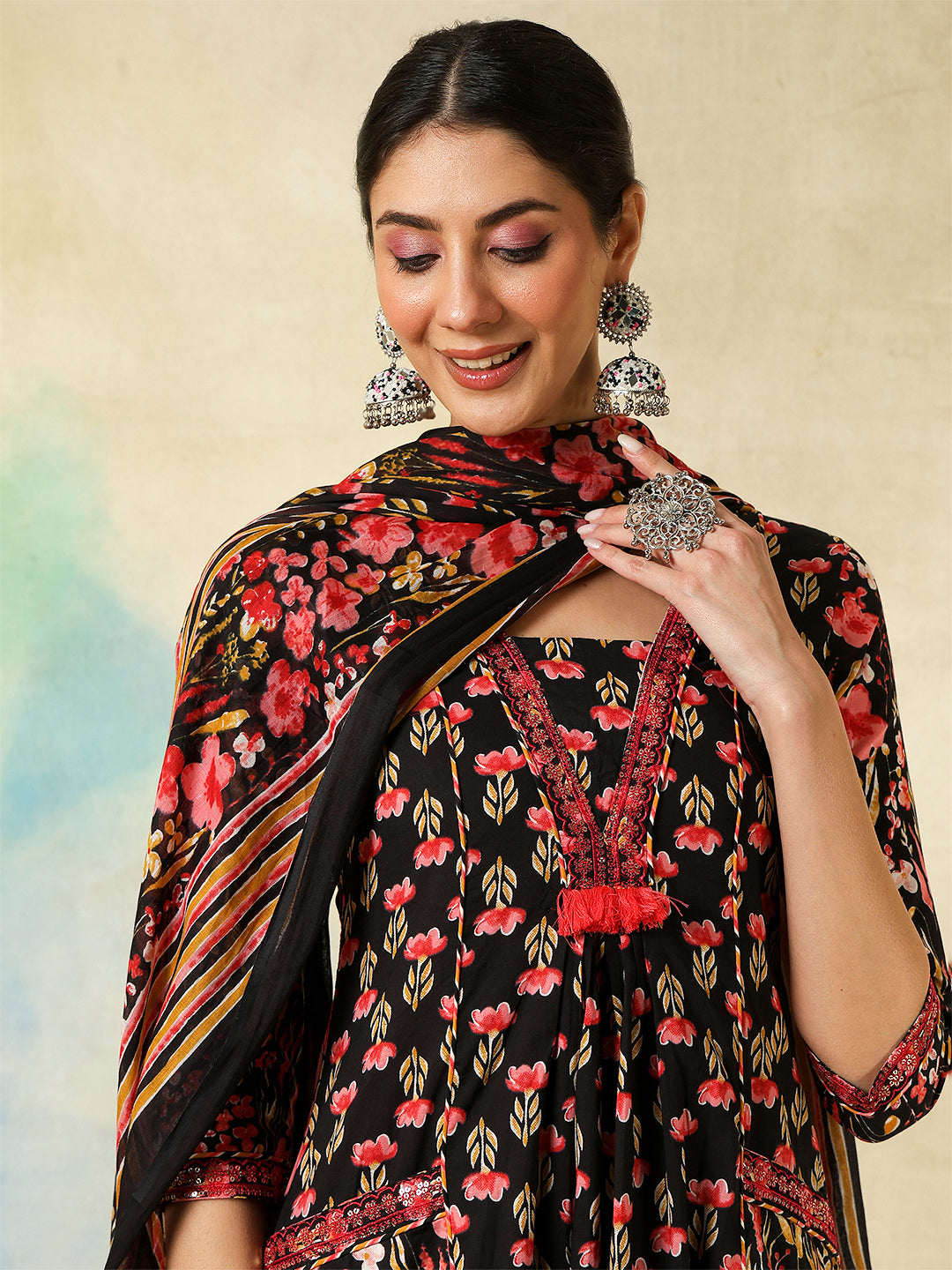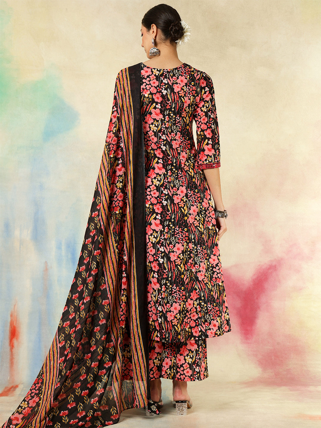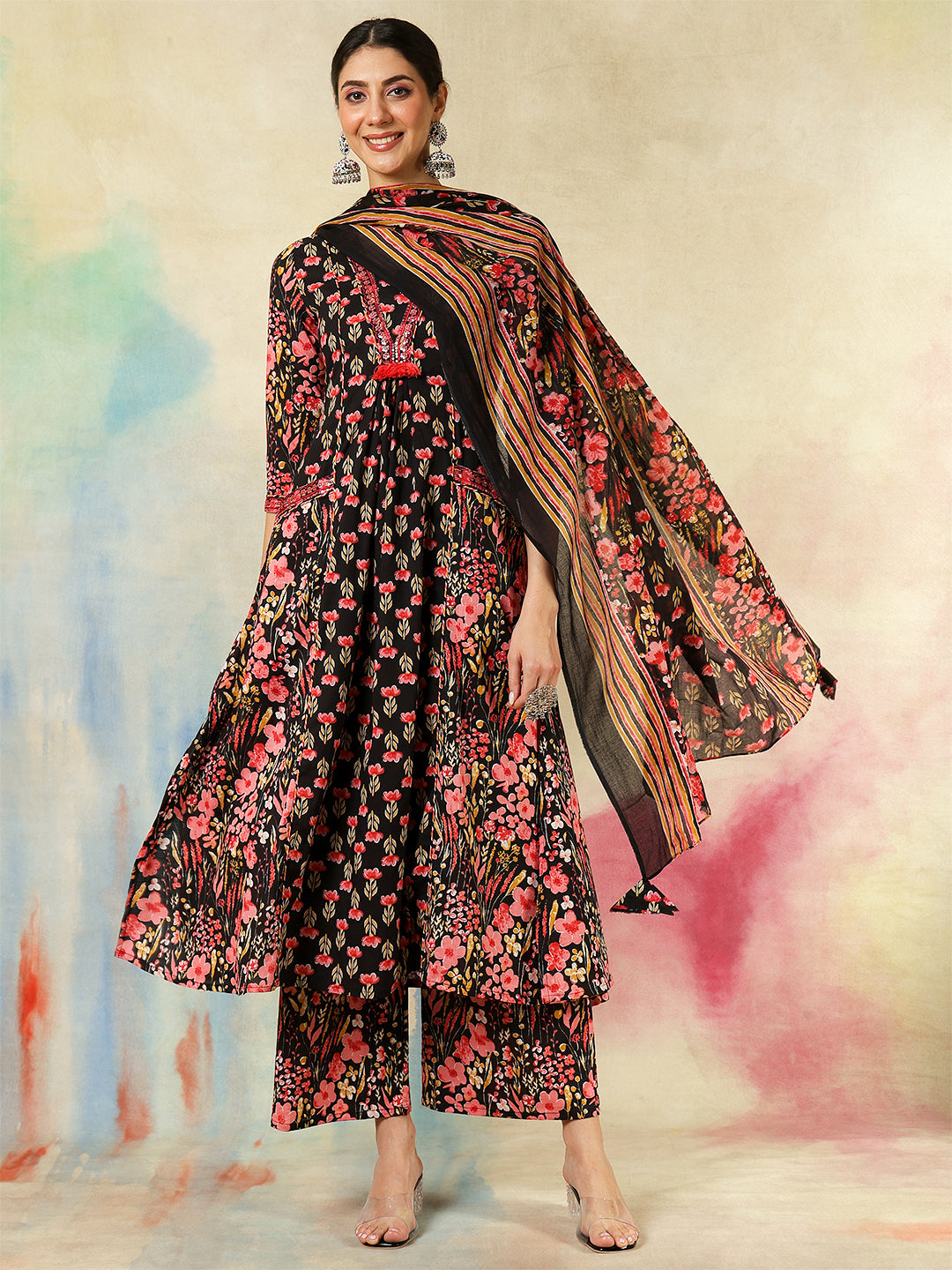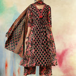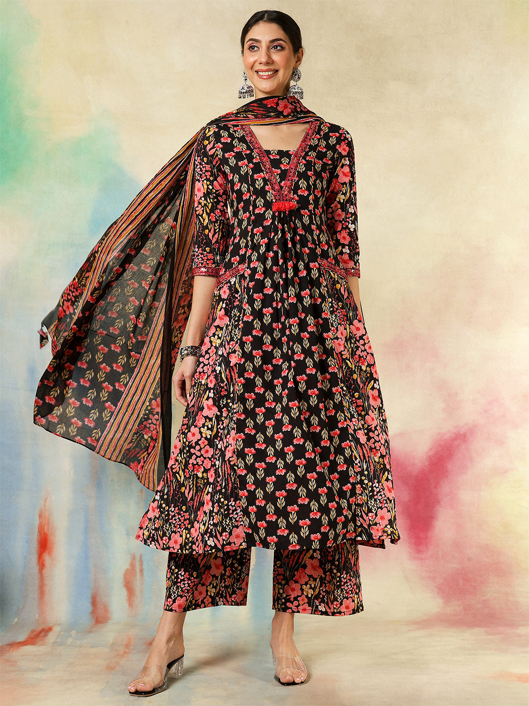 Cotton Calf Length Embroidered Printed A-Line3/4 Sleeves V-Neck Kurta Suit Set With Dupatta (Preorder)