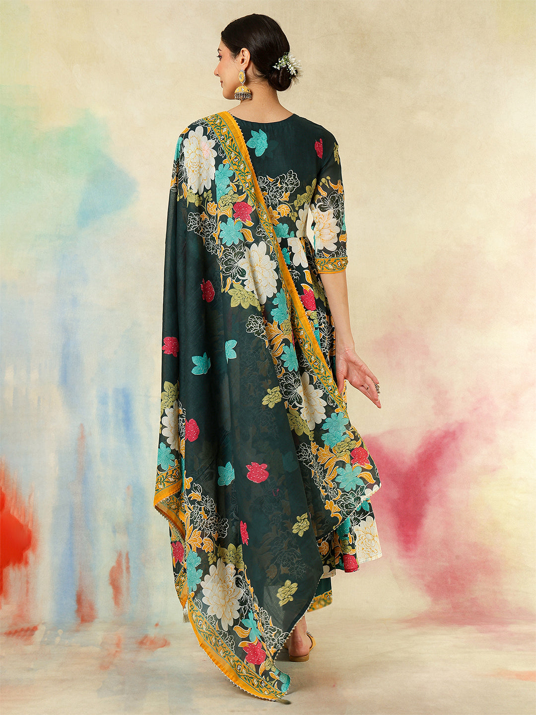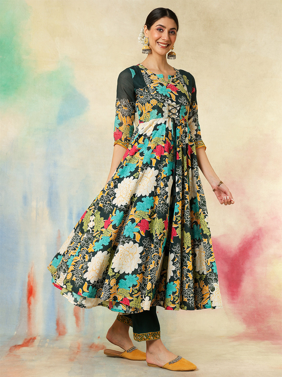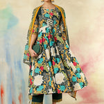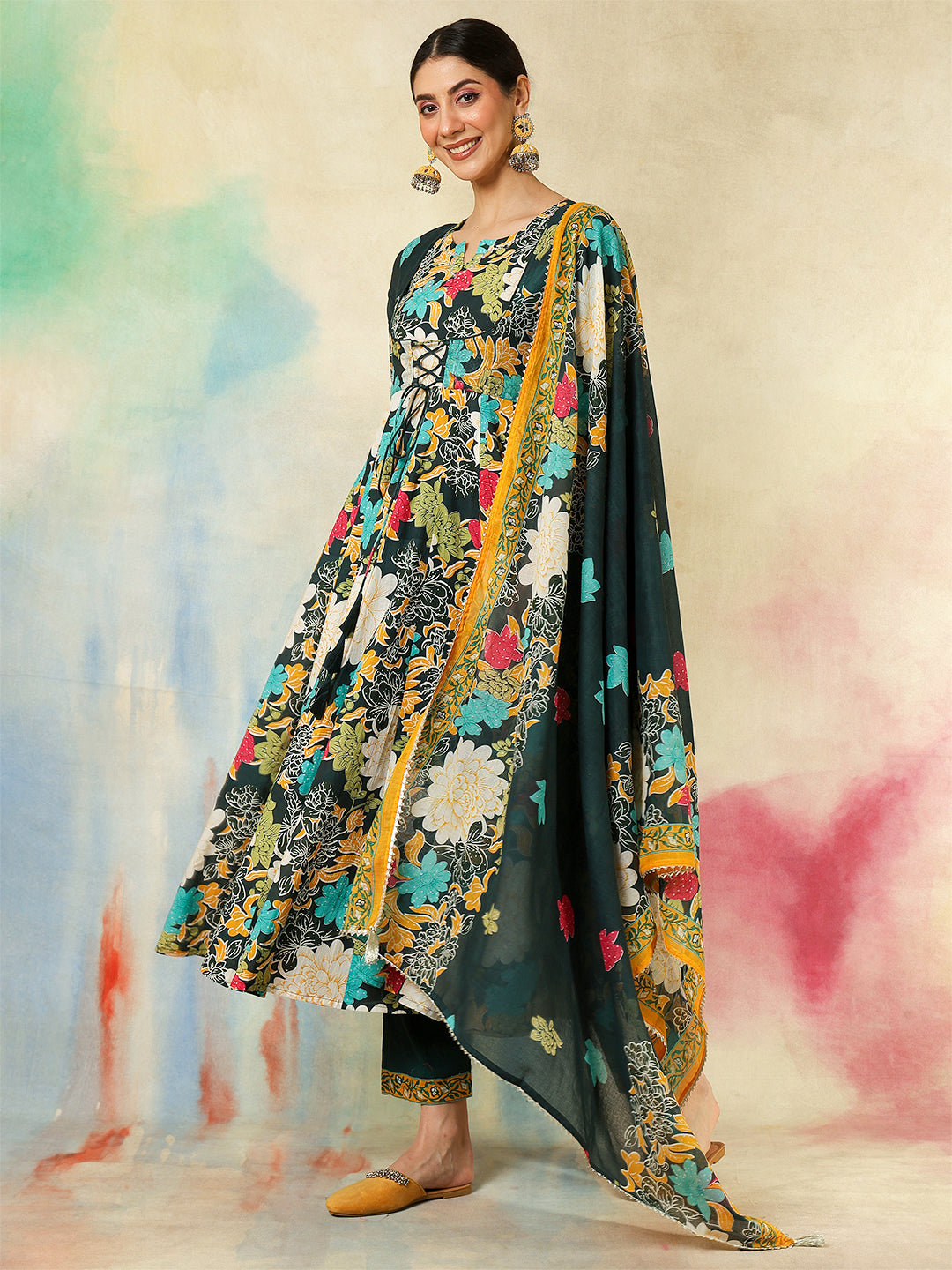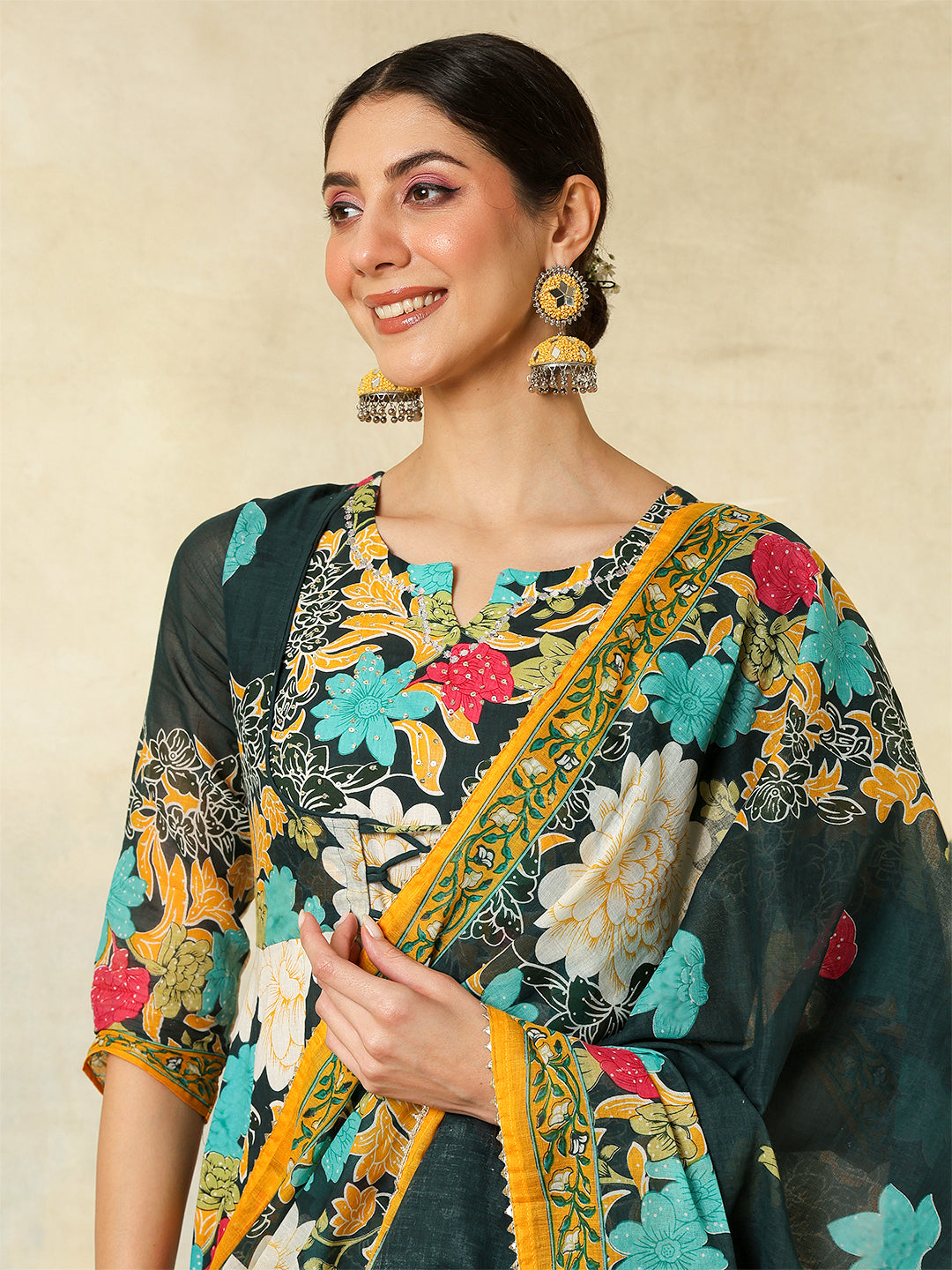 Cotton Flared Printed A-Line3/4 Sleeves Round Neck Kurta Suit Set With Dupatta (Preorder)