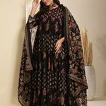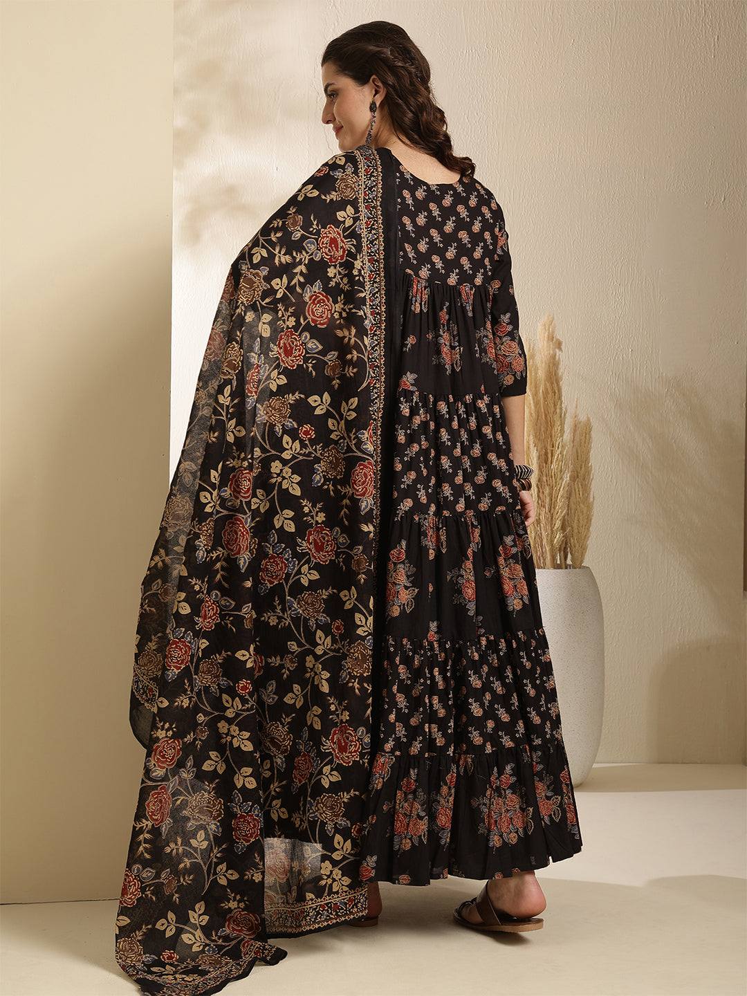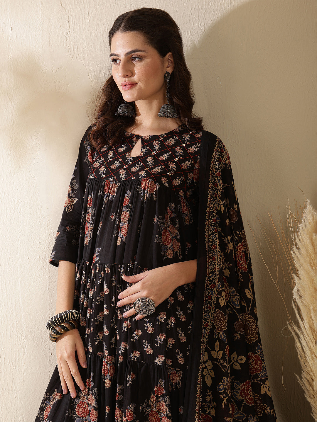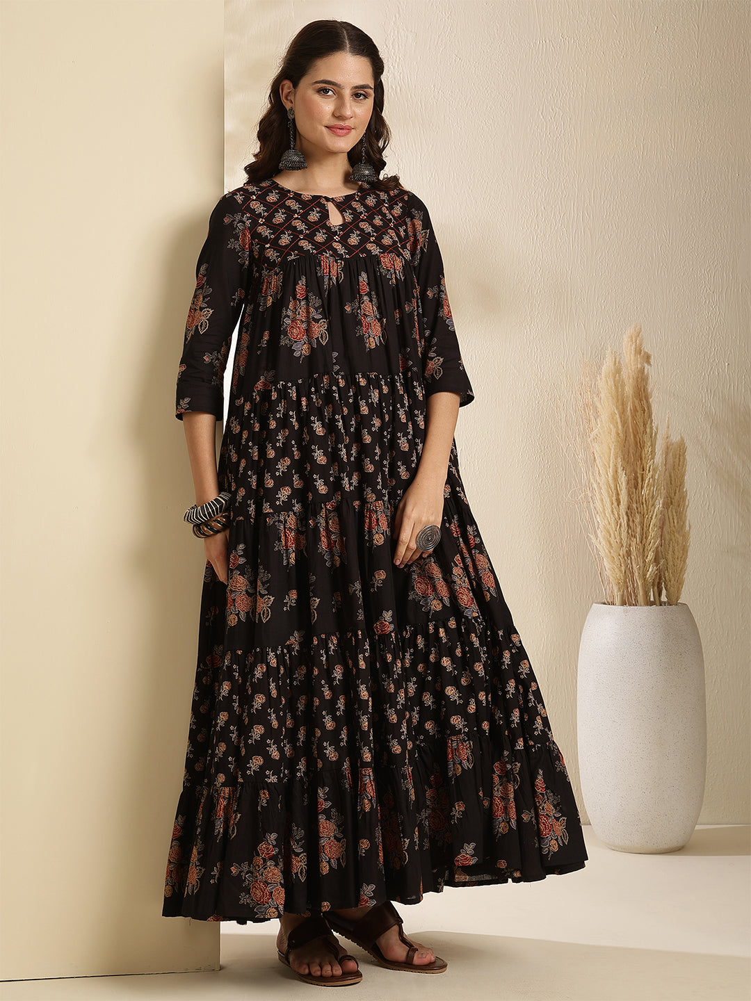 Cotton Calf Length Printed 3/4 Sleeve Key Hole Neck Tired Kurta Bottom With Dupatta (Preorder)