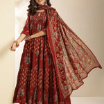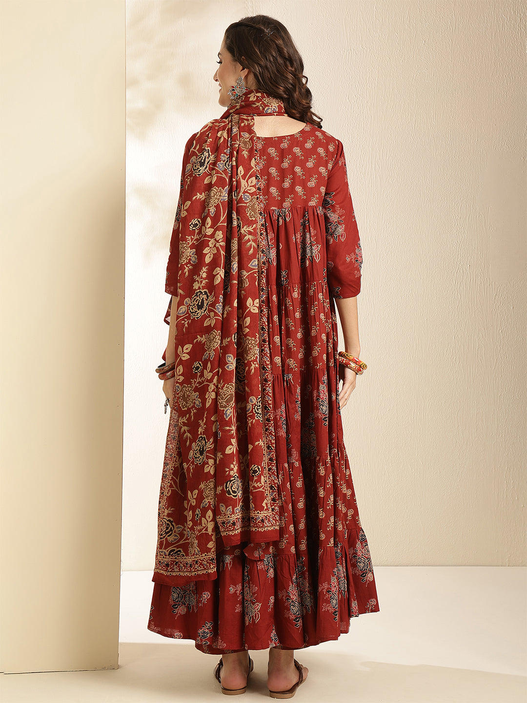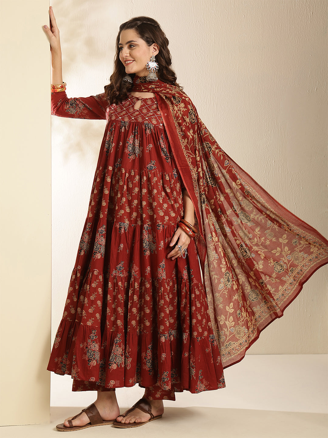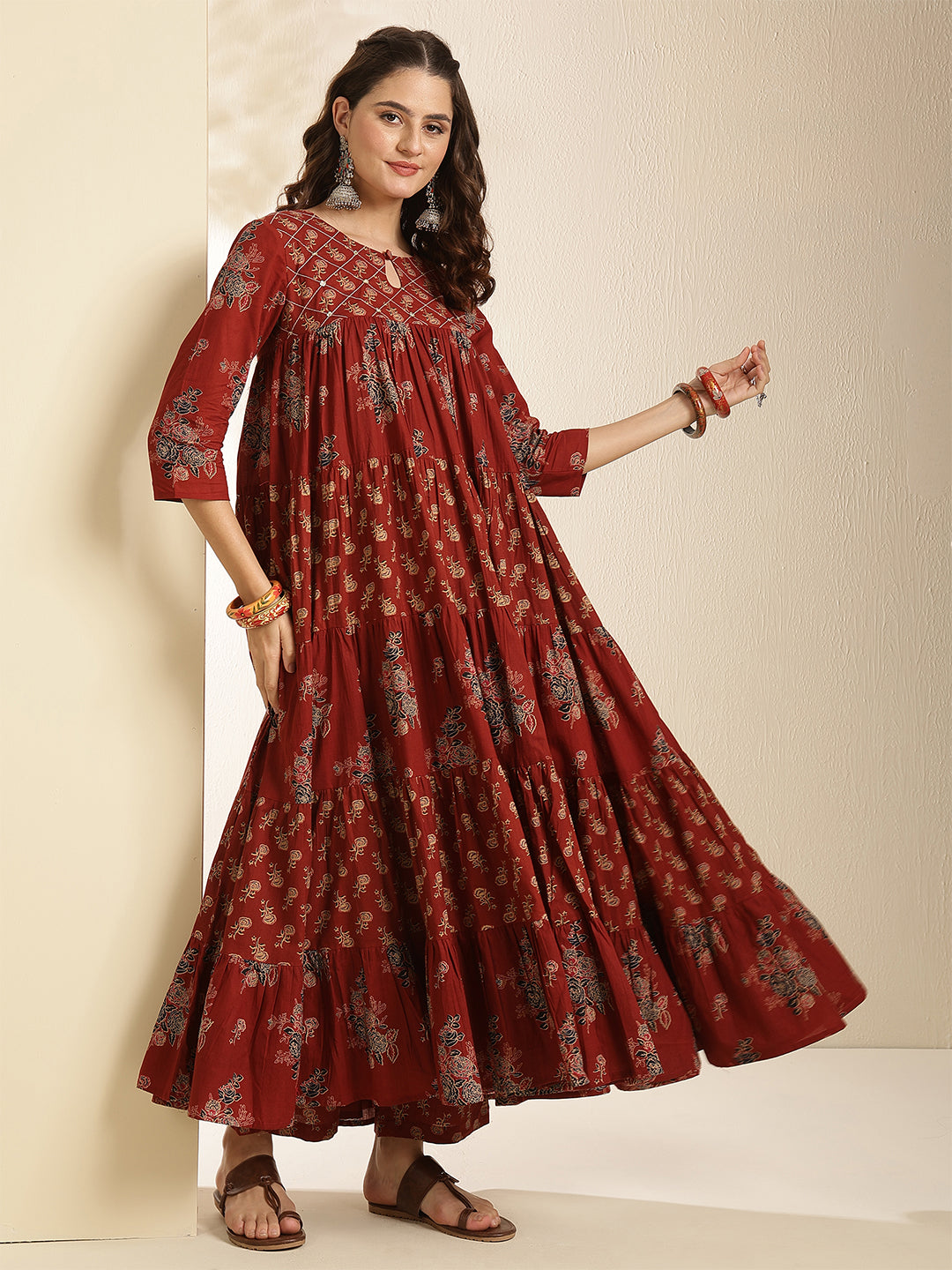 Cotton Calf Length Printed 3/4 Sleeve Key Hole Neck Tired Kurta Bottom With Dupatta (Preorder)