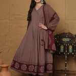 Cotton Calf Length Printed 3/4 Sleeves V-Neck Anarkali Kurta Bottom With Dupatta (Preorder)