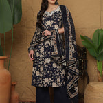 Cotton Calf Length Printed 3/4 Sleeves Round Neck Straight Kurta Bottom With Dupatta (Preorder)