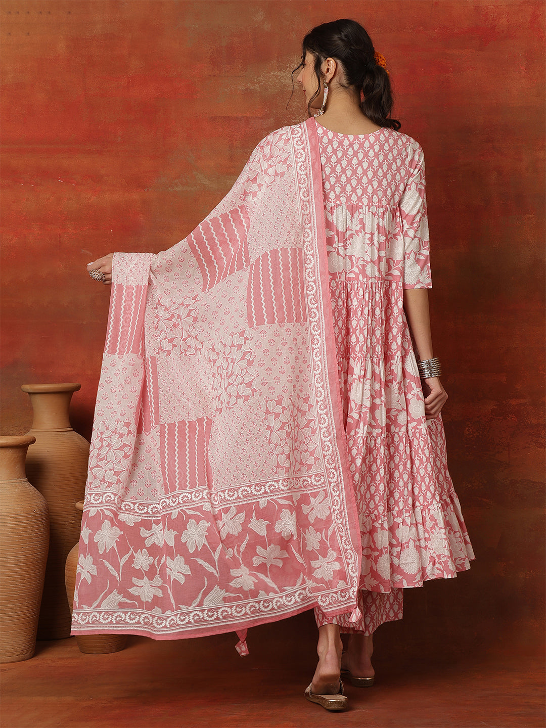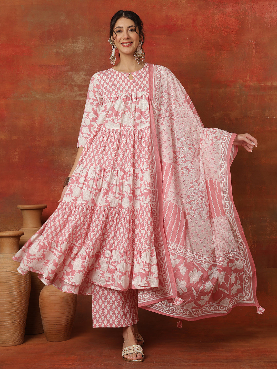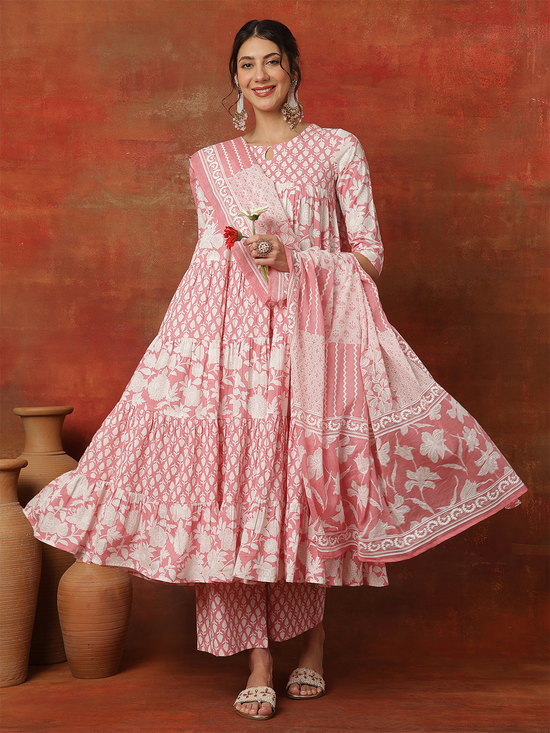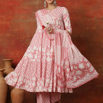 Cotton Ankle Length Printed 3/4 Sleeves Round Neck Full Flared Kurta Bottom With Dupatta (Preorder)