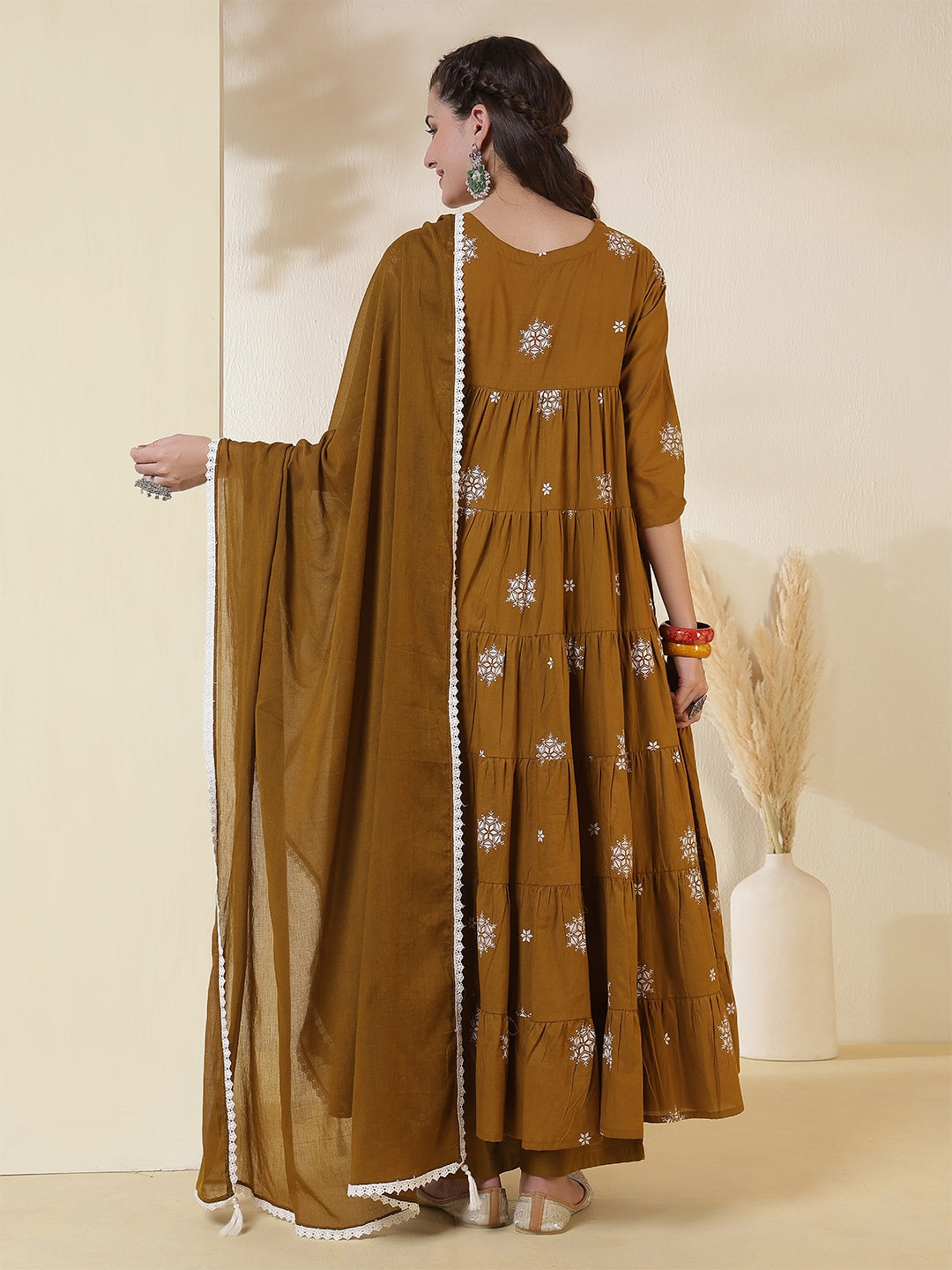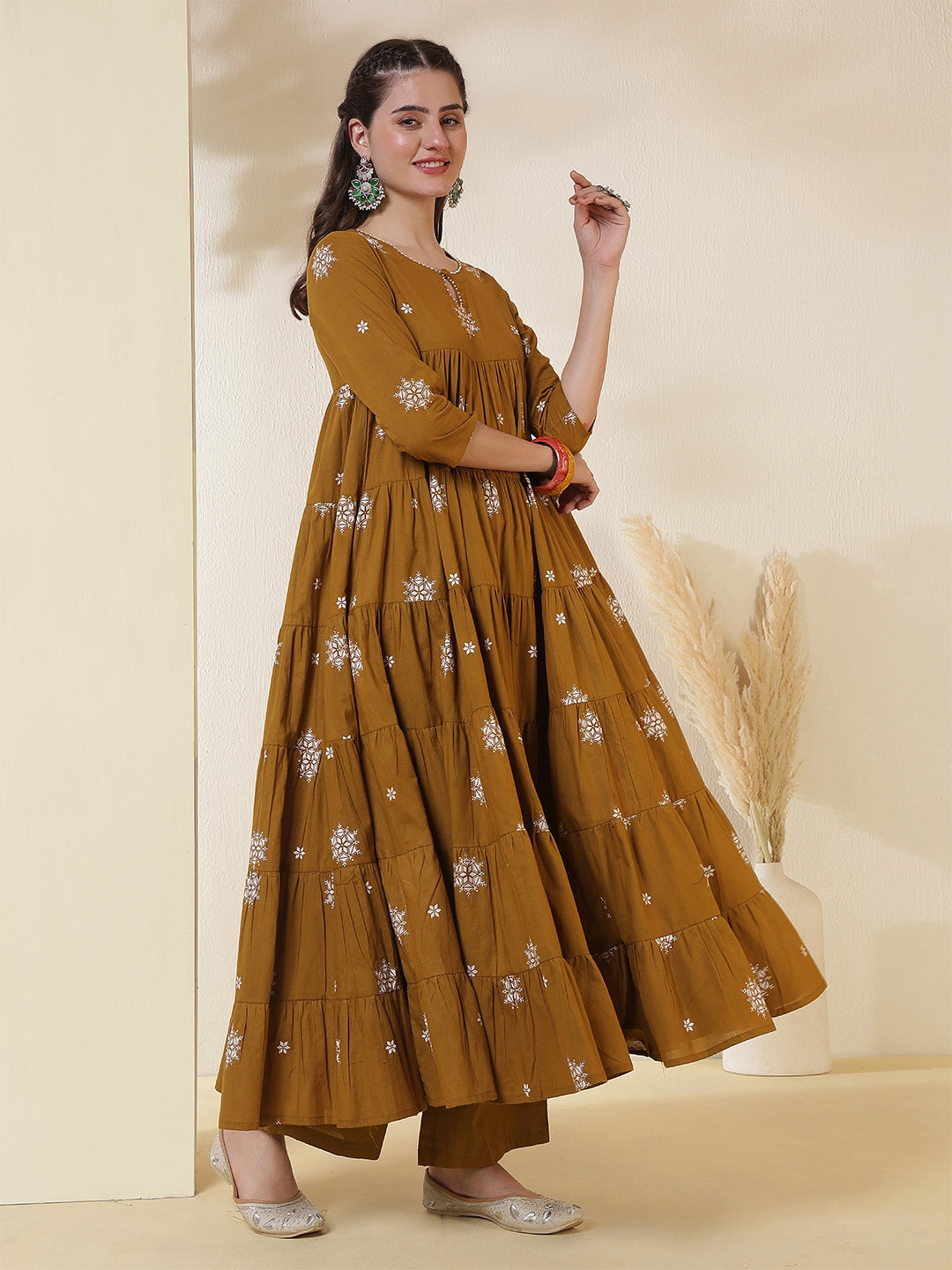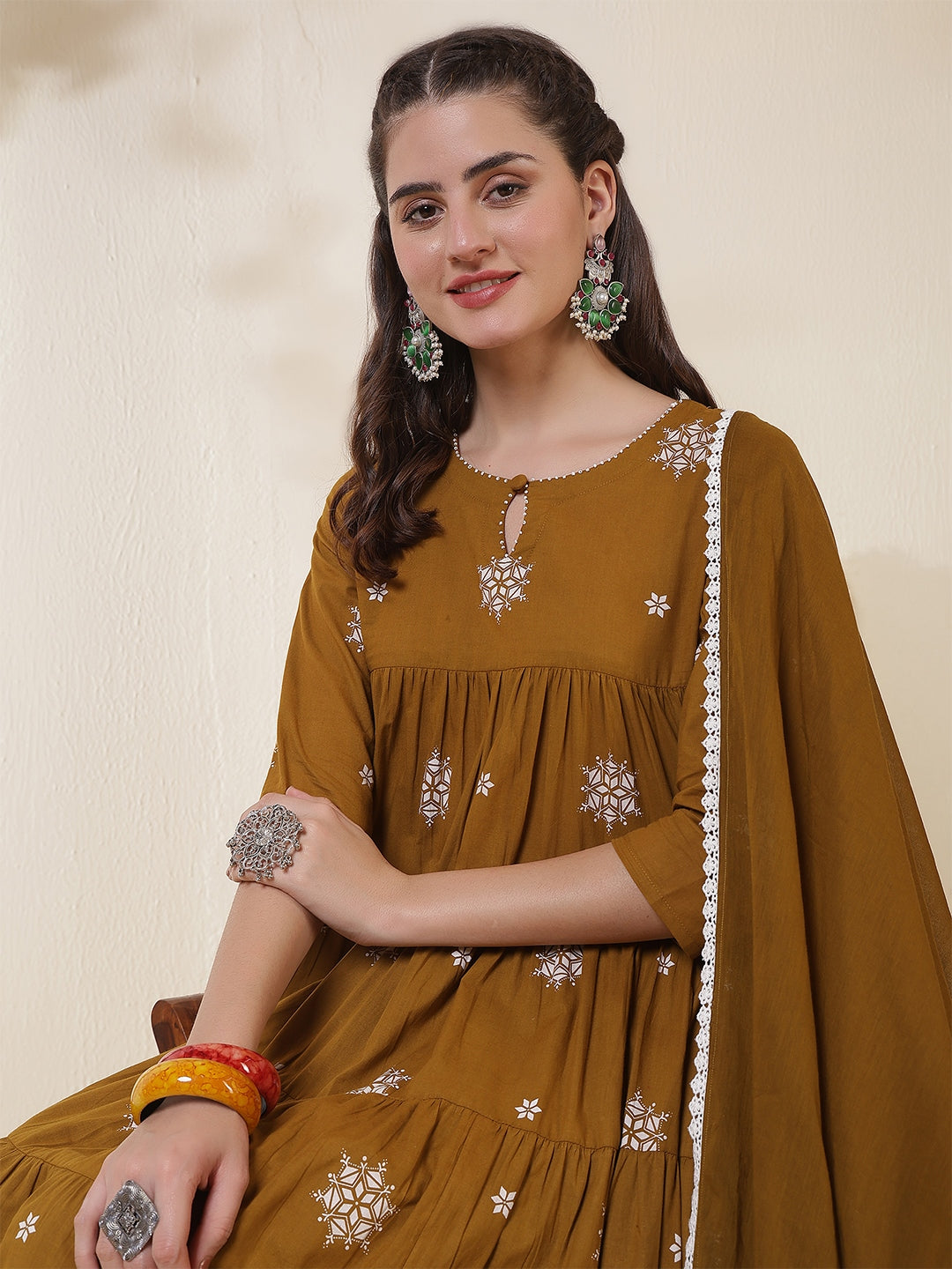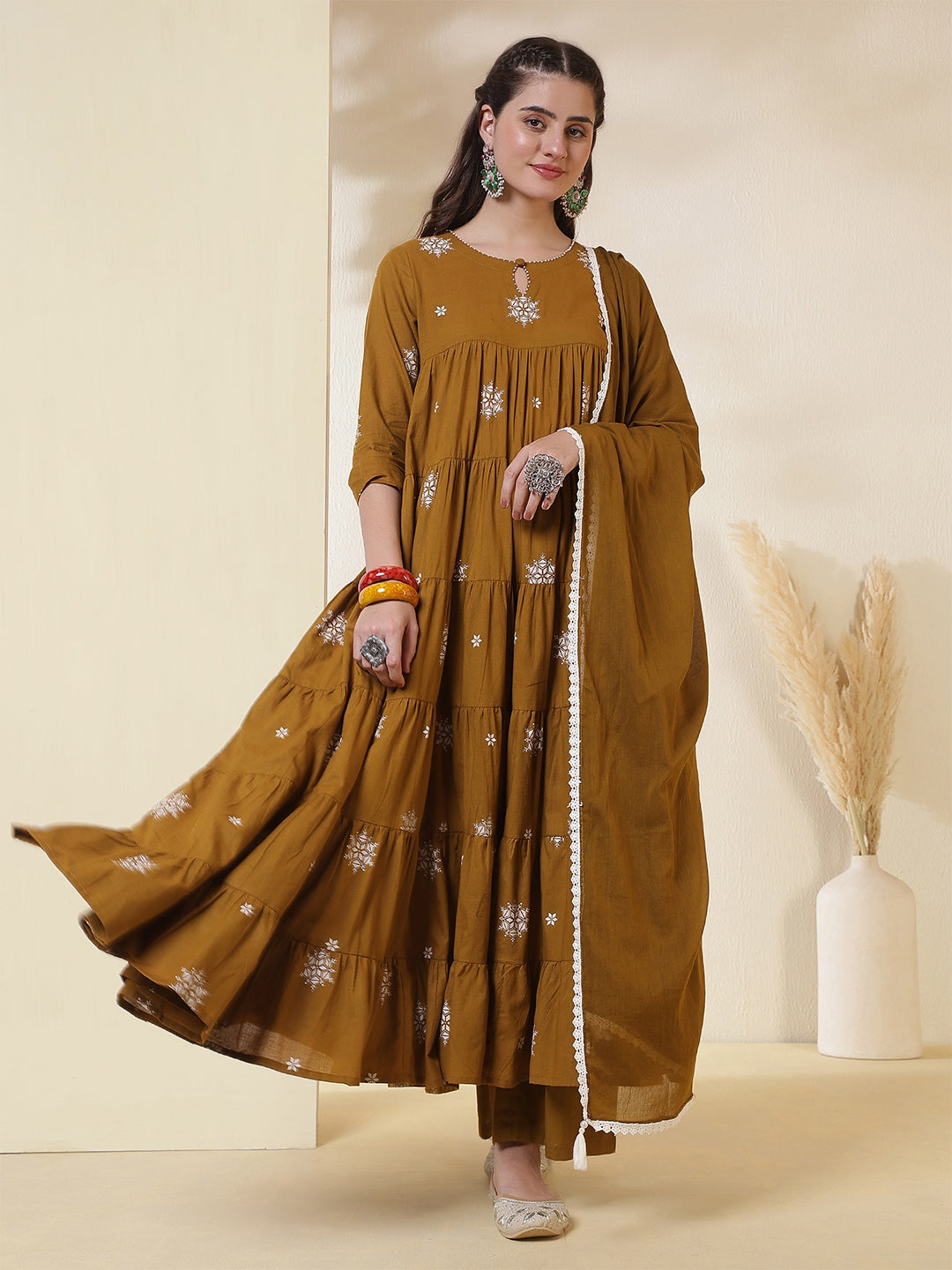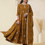 Cotton Calf Length Printed 3/4 Sleeves Round Neck Anarkali Kurta Suit Set With Dupatta (Preorder)