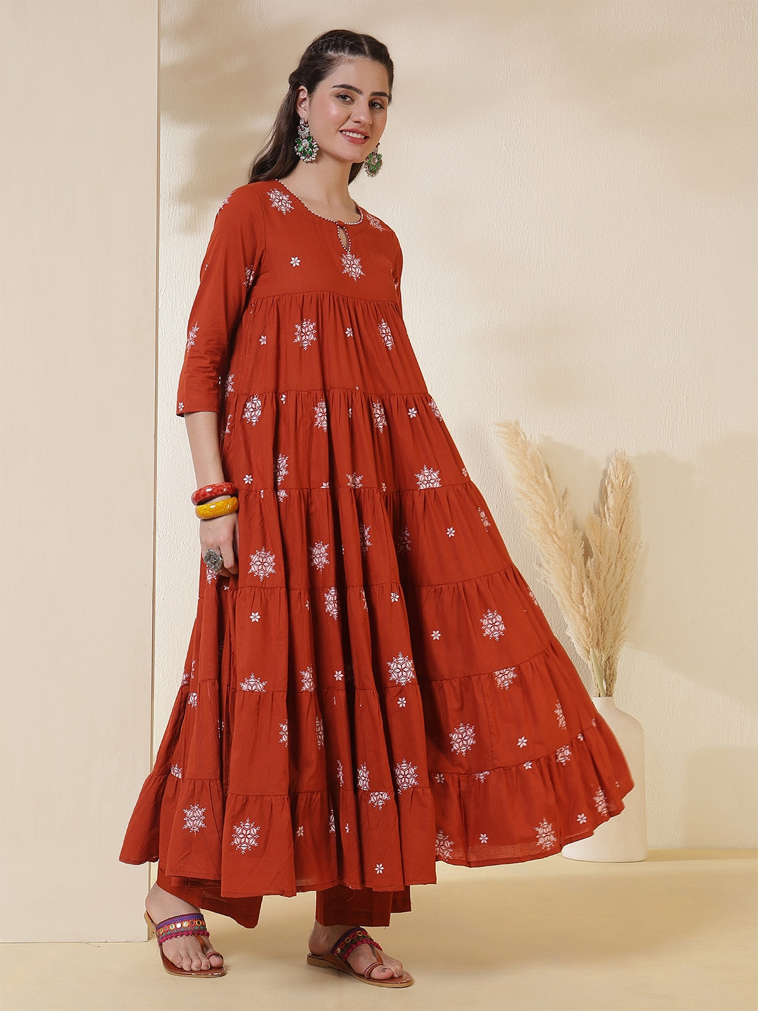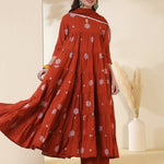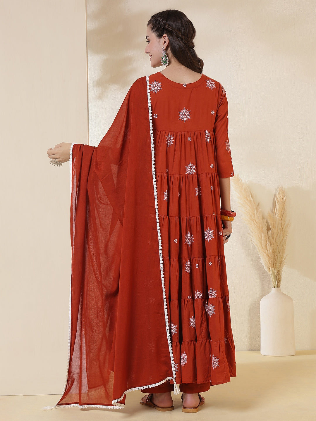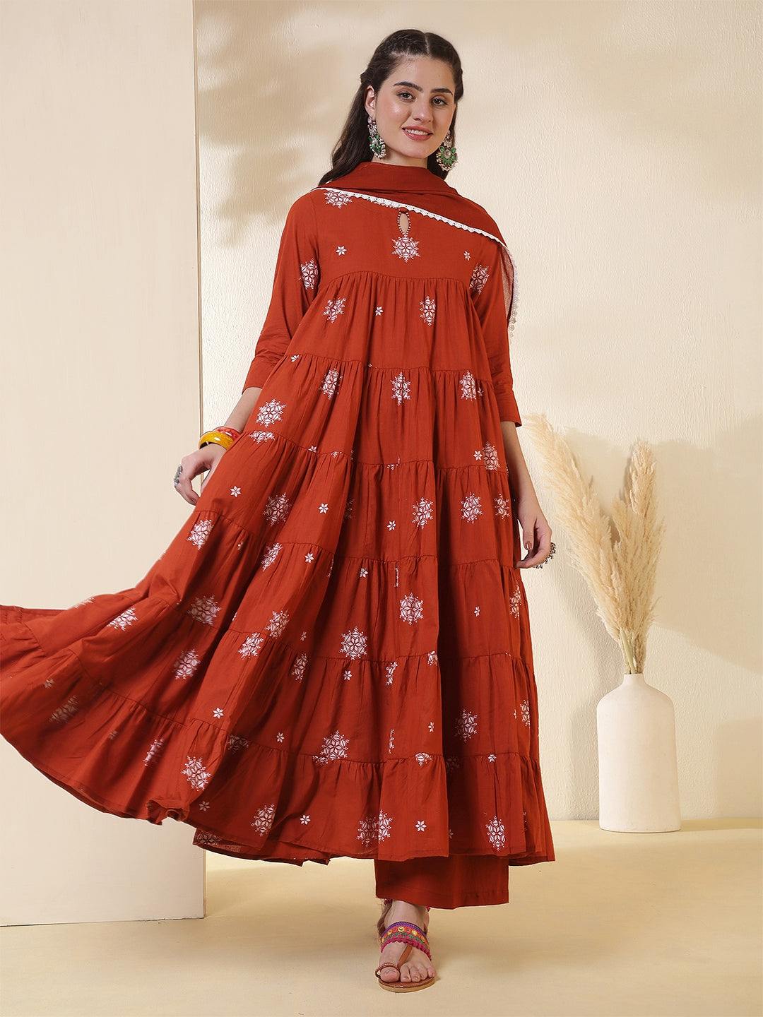 Cotton Calf Length Printed 3/4 Sleeves Round Neck Anarkali Kurta Suit Set With Dupatta (Preorder)