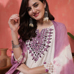 Jacquard Knee Length Solid 3/4 Sleeves Round Neck Flared Kurta Suit Set With Dupatta (Preorder)