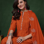 Cotton Calf Length Solid 3/4 Sleeves Mandarin Straight Kurta Suit Set With Dupatta (Preorder)