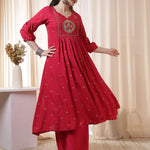 Rayon Calf Length Printed 3/4 Sleeves Round Neck Flared Kurta Suit Set With Dupatta (Preorder)