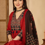Rayon Calf Length Solid 3/4 Sleeve V-Neck Flared Kurta Suit Set With Dupatta (Preorder)