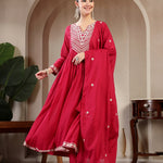 Cotton Calf Length Solid 3/4 Sleeve Round Neck Flared Kurta Suit Set With Dupatta (Pre-Order)