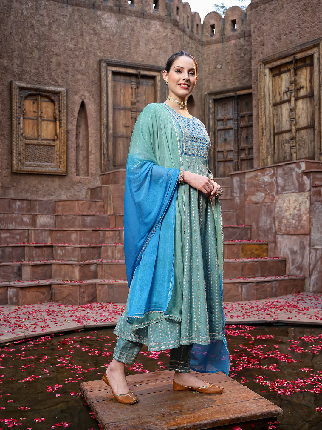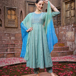 Woven Designed & Embroidered Cotton Blend Anarkali Kurta Pant Dupatta Set (Pre-Order)