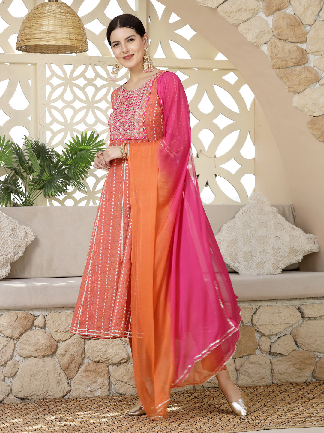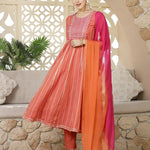Woven Designed & Embroidered Cotton Blend Anarkali Kurta Pant Dupatta Set (Pre-Order)