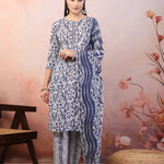 Blue Printed Cotton Straight Kurta Pant Dupatta Set (Pre-Order)