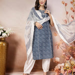 Blue Lehriya Printed & Embroidered Cotton Straight Kurta Pant Dupatta Set (Pre-Order)
