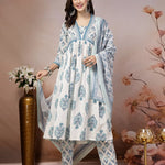 White Ethnic Motif Printed Cotton A-Line Kurta Pant Dupatta Set (Pre-Order)