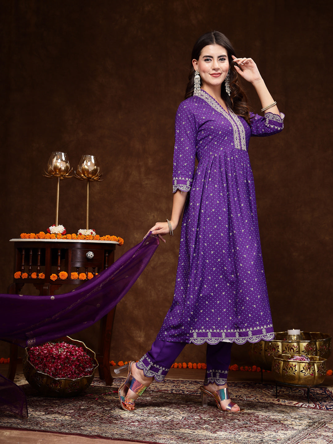 Violet Bandhani Printed & Embroidered Rayon Flared Kurta Pant Dupatta Set (Pre-Order)