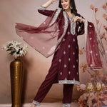 Wine Ethnic Motif Printed & Embroidered Rayon Straight Kurta Pant Dupatta Set (Pre-Order)
