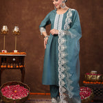 Aqua Embroidered Silk Blend Straight Kurta Pant Dupatta Set (Pre-Order)