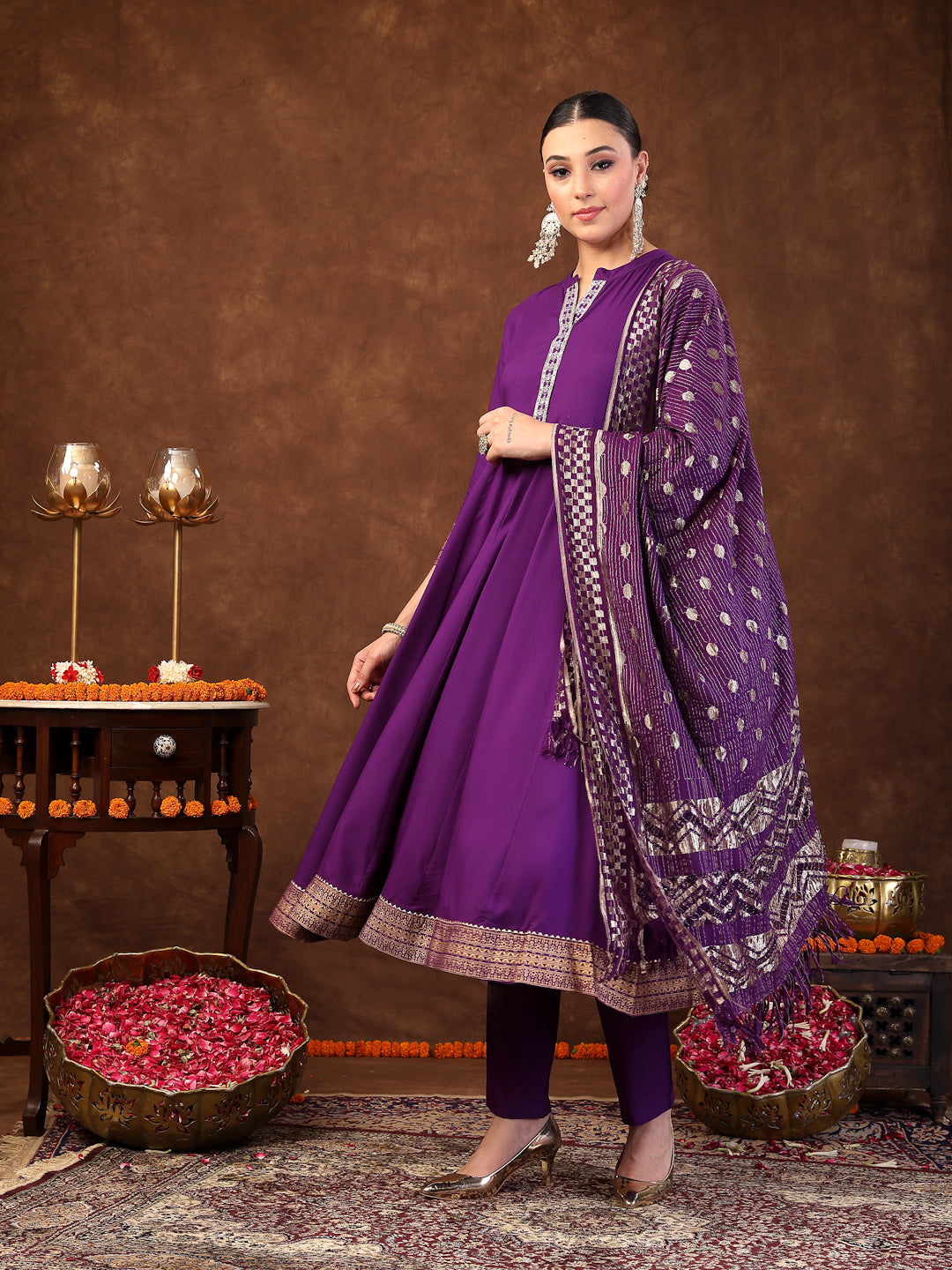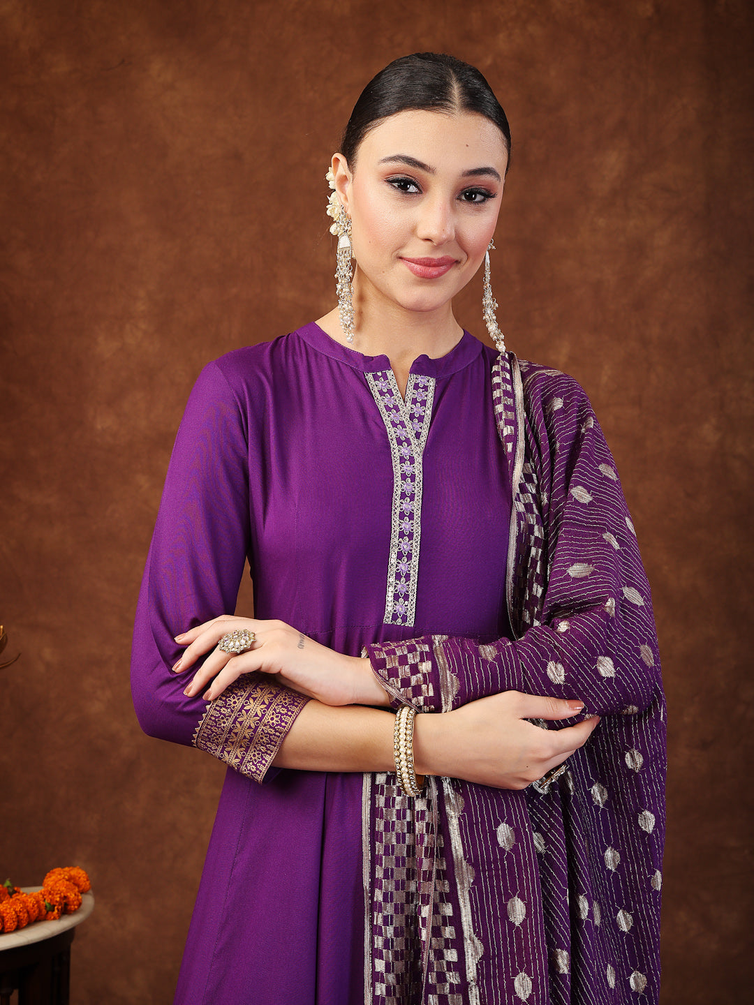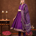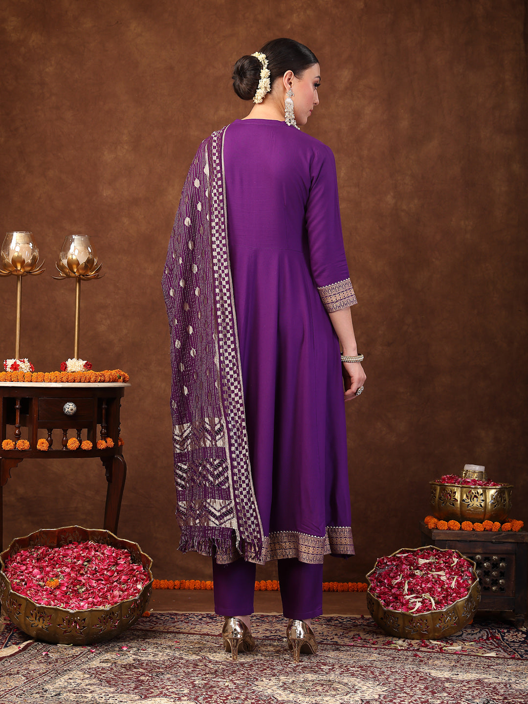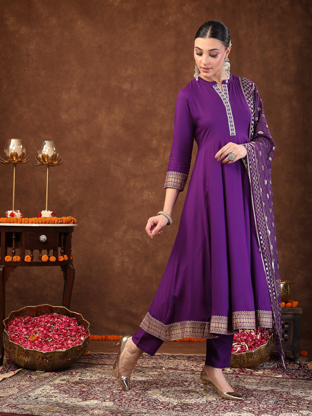 Violet Solid & Embroidered Rayon Anarkali Kurta Pant Dupatta Set (Pre-Order)