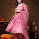 Mulberry Pink Solid & Embroidered Italian Crush Anarkali Kurta Pant Dupatta Set (Pre-Order)