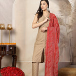 Beige Gold Printed Rayon A-Line Kurta Pant Dupatta Set (Pre-Order)