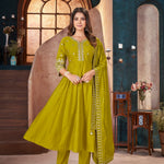 Lime Green Solid & Embroidered Silk Anarkali Kurta Pant Dupatta Set (Pre-Order)