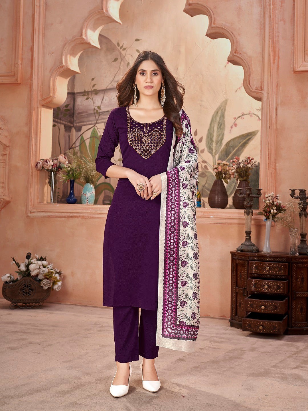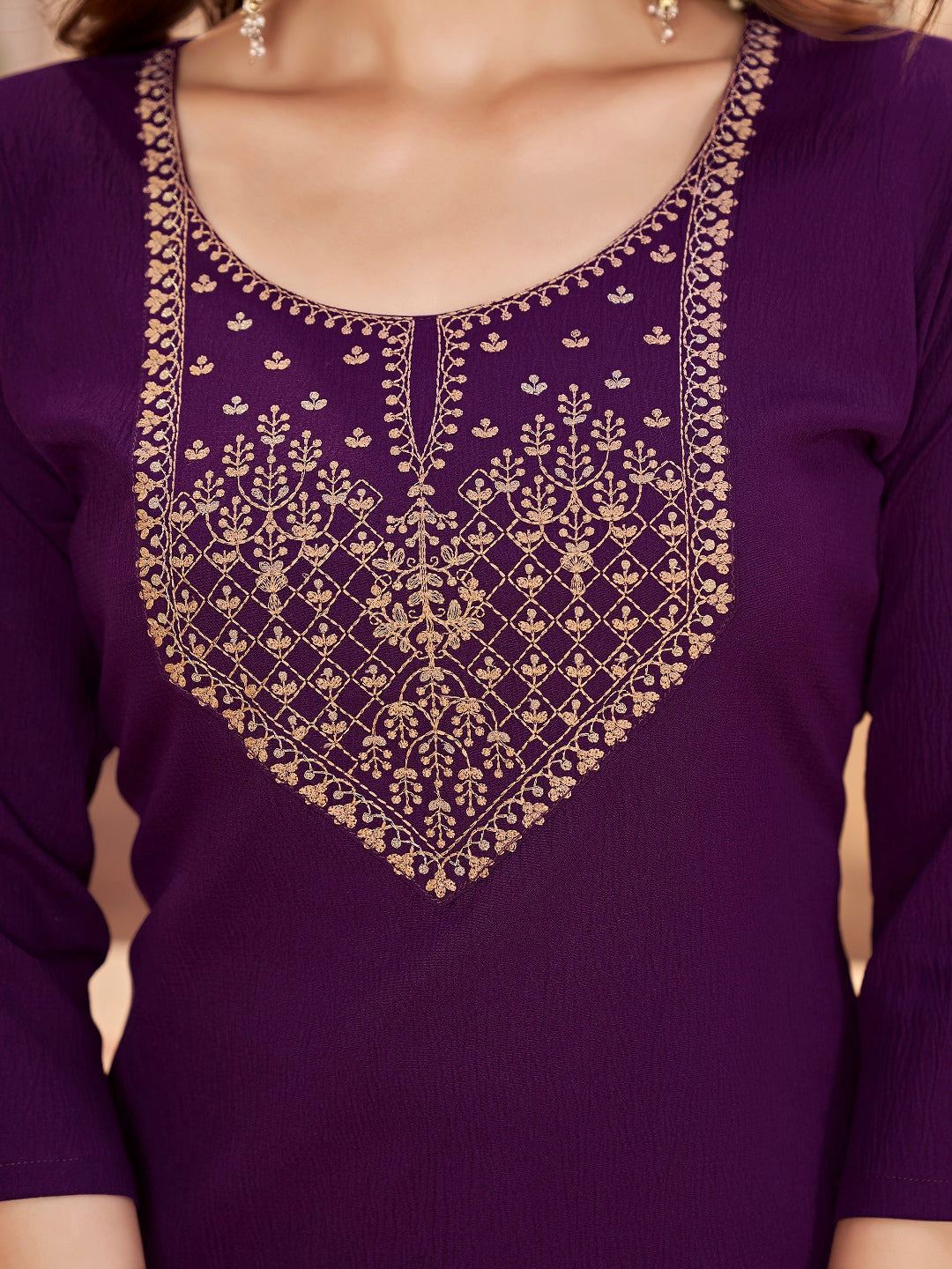 Violet Solid & Embroidered Crepe Straight Kurta Pant Dupatta Set (Pre-Order)
