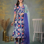 Blue Floral Printed & Embroidered Rayon Alia Cut Kurta Pant Dupatta Set (Pre-Order)
