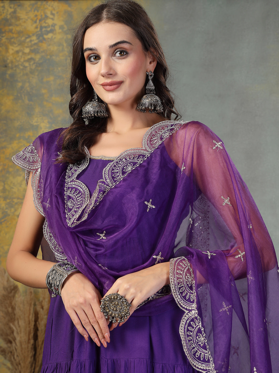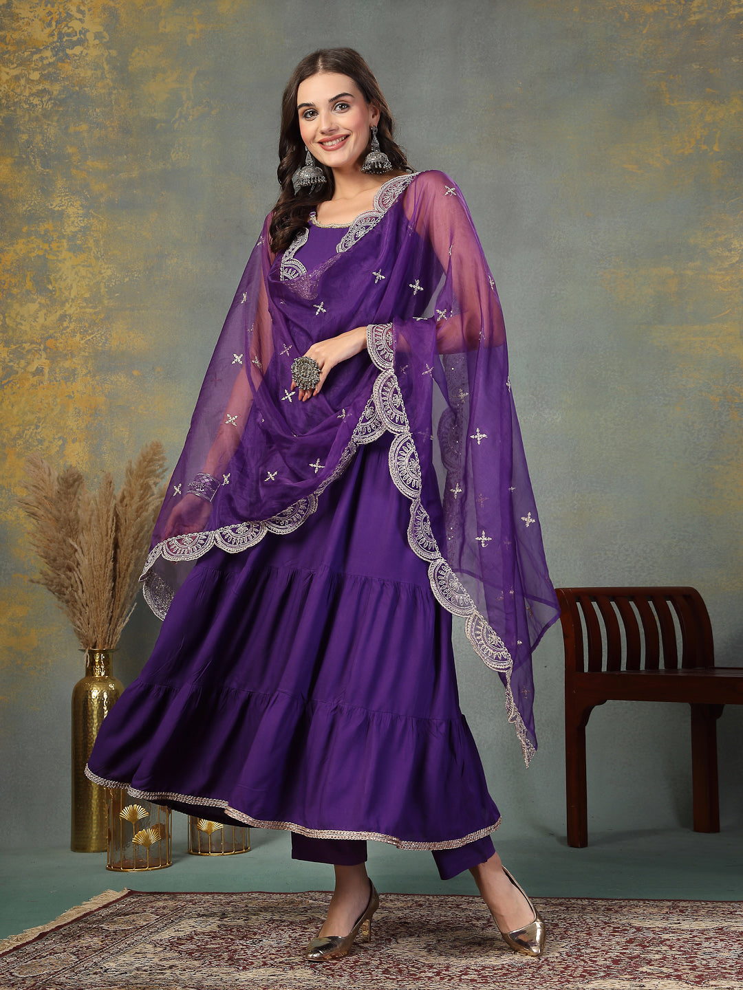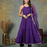 Violet Solid Rayon Tiered Kurta Pant Dupatta Set (Pre-Order)