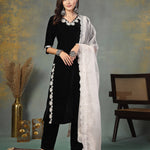 Black Solid & Embroidered Velvet Straight Kurta Pant Dupatta Set (Pre-Order)