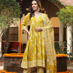 Yellow Floral Printed Cotton Anarkali Kurta Pant Dupatta Set (Pre-Order)