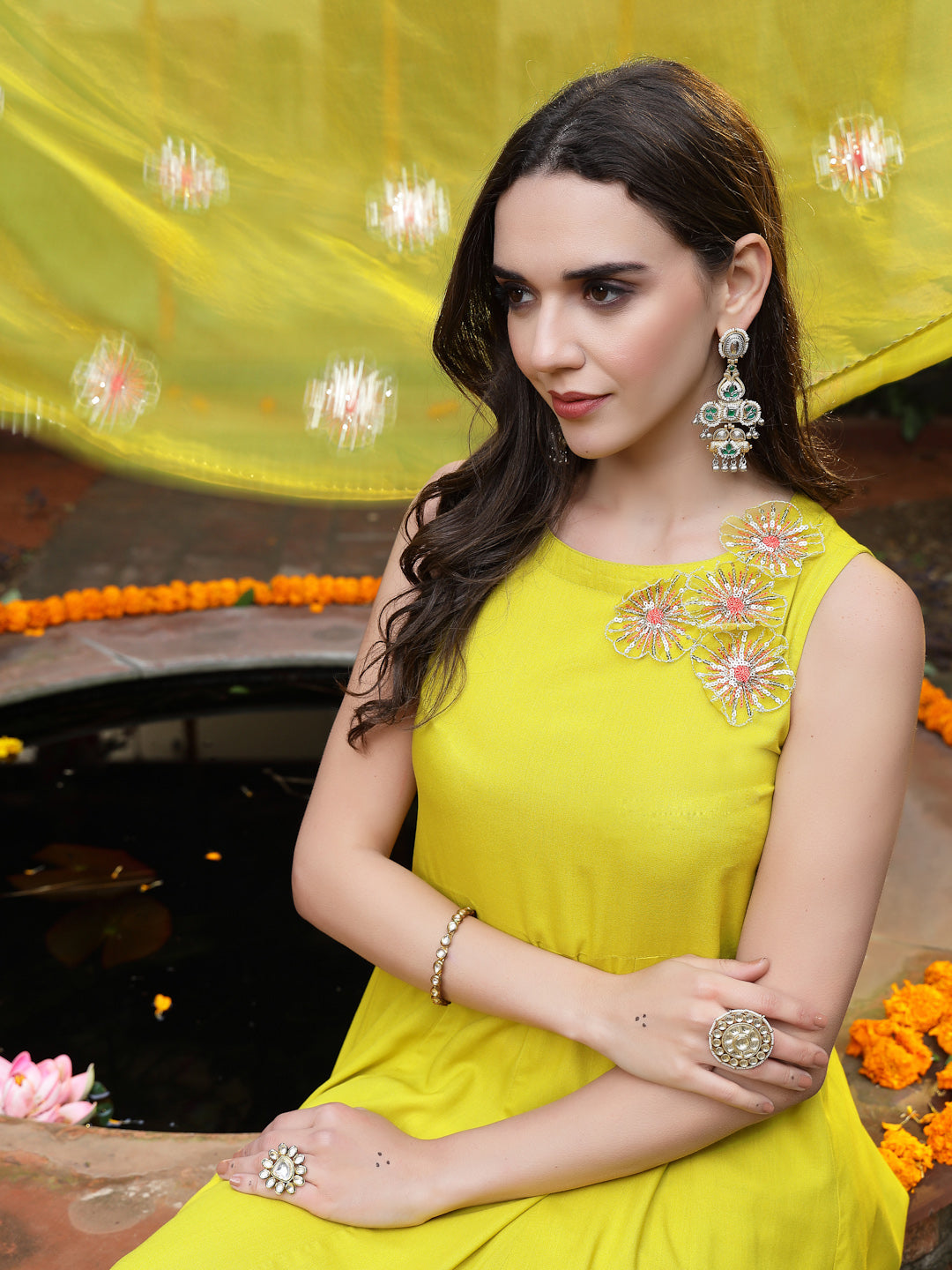 Corn Solid & Embellished Rayon Flared Kurta Palazzo Dupatta Set (Pre-Order)